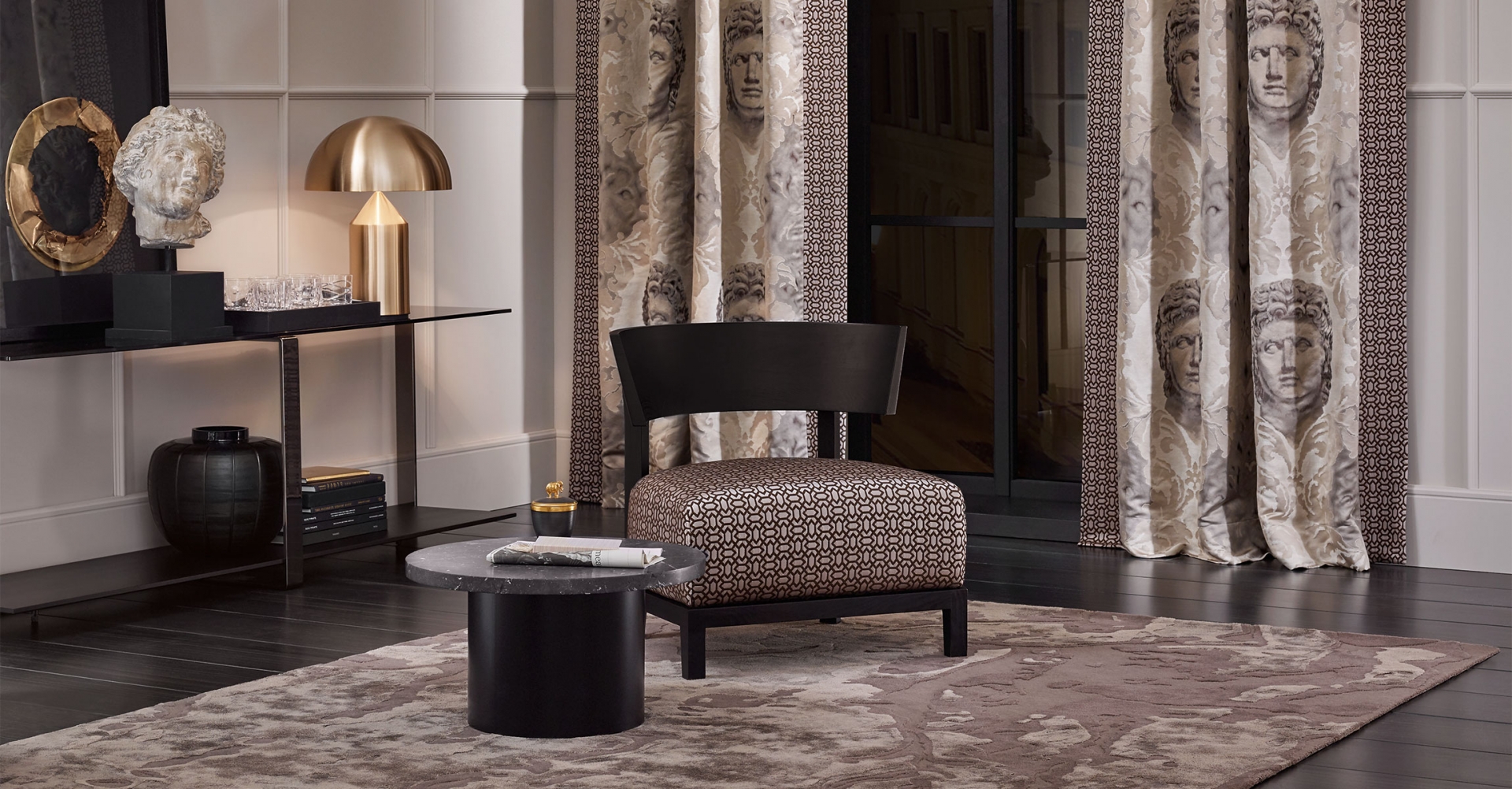 Смело смешивает то, что кажется несочетаемым. В результате мы можем видеть не просто кусок ткани или обоев, а уже готовый фрагмент интерьера, который уже несет в себе характер и смысл и задает тон всего пространства. Фактуры тканей столь необычны, что создается впечатление, будто они из интерьера будущего попали к нам в настоящее.
