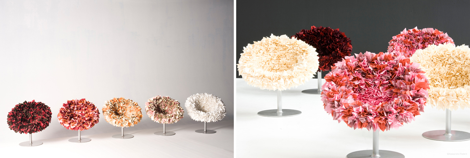 Дизайнер изготовил свое кресло из тысячи разноцветных салфеток, выложив таким способом, чтобы они напоминали букет из множества цветов, а человек, сидящий в этом кресле, ощутил легкость, невесомость, словно парящая бабочка над растениями. Позже, удовлетворенный своим изобретением, дизайнер в практичных целях заменил салфетки на ткани разных цветов.