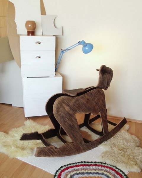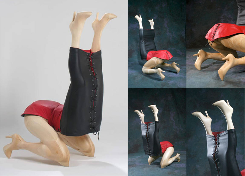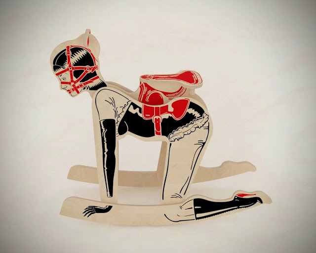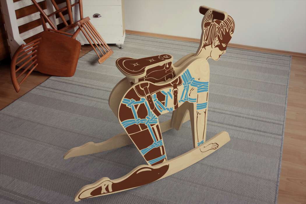 Peter Jakubik придумал такую себе игрушку для взрослых: деревянную качалку. Но вместо, привычной нам, лошадки, дизайнер изобразил деревянную женщину Pony Girl и поставил ее в очень интересную и в очень «неприличную» позу. Догадываетесь в какую?! «Деревянная женщина» стоит на полукруглых деталях, как на качалке-лошадке, имеет удобное место для сидения сверху и различные варианты рисунков «одежды»: элементы связывания, убранство из латекса, корсеты из кружева, чулки. «Одежда», «прически» нарисованы акриловыми красками.
