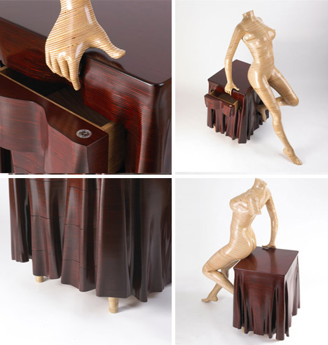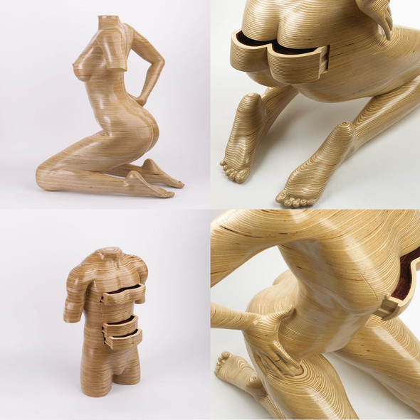 Говорят, что самые лучшие и востребованные художники, те, которые отказались от основных и привычных методов и материалов, а стали мастерами именно своего дела. Так, британский дизайнер Peter Rolfe, мастер проектирования из дерева, начал изготавливать свою неповторимую коллекцию непристойных эротических предметов мебели. Нашему вниманию он представил деревянную женщину, с точеными формами, каким бы позавидовала любая топ-модель, отполированную до нежнейшей гладкости. А что самое главное - женщину с секретиками! Женщина без секретов и тайн – не женщина! В деревянной диве полно невидимых открывающихся и закрывающихся ящичков и полочек и других выдвижных элементов. Даже в самых неожиданных и непристойных местах!